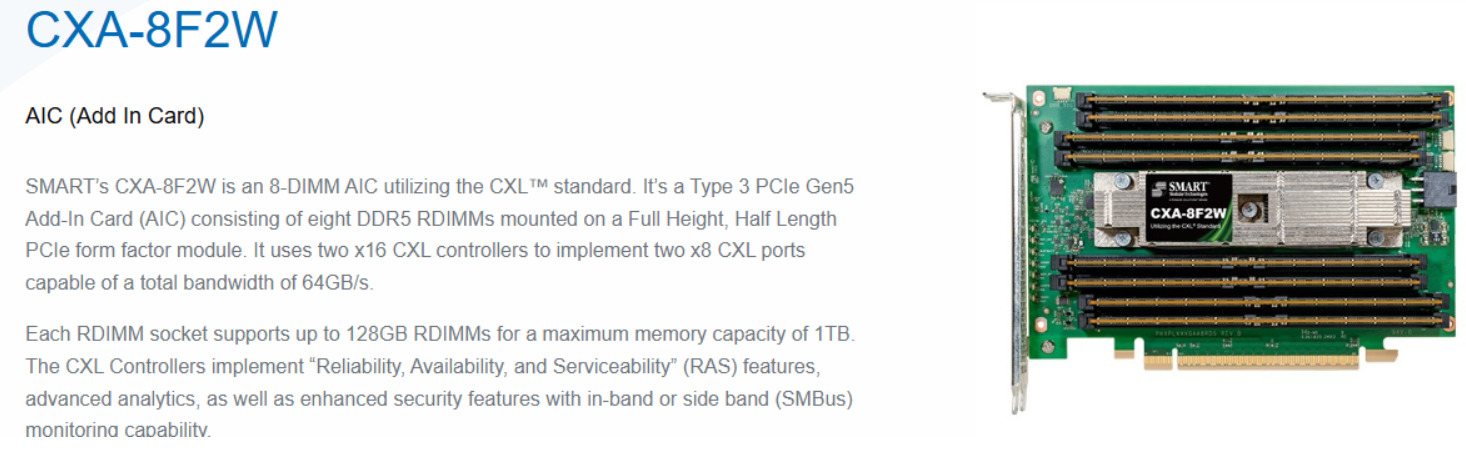 표준 PCIe 슬롯에 장착되는 카드 형태로, 여러 개의 DDR5 DIMM을 탑재하여 메모리 용량을 확장합니다. SMART Modular's 8-DIMM Add-In Card - CXA-8F2W