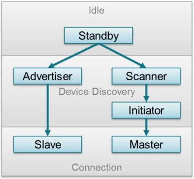 Roles : Advertiser, Scanner (passive / active with scan_request and response ), Master, Slave