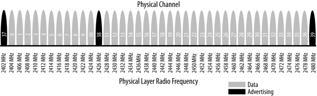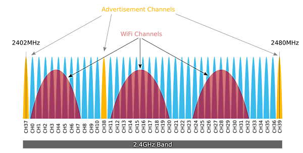 2.4Ghz ISM band, 37, 38, 39 channel is for broadcasting and connection setup.