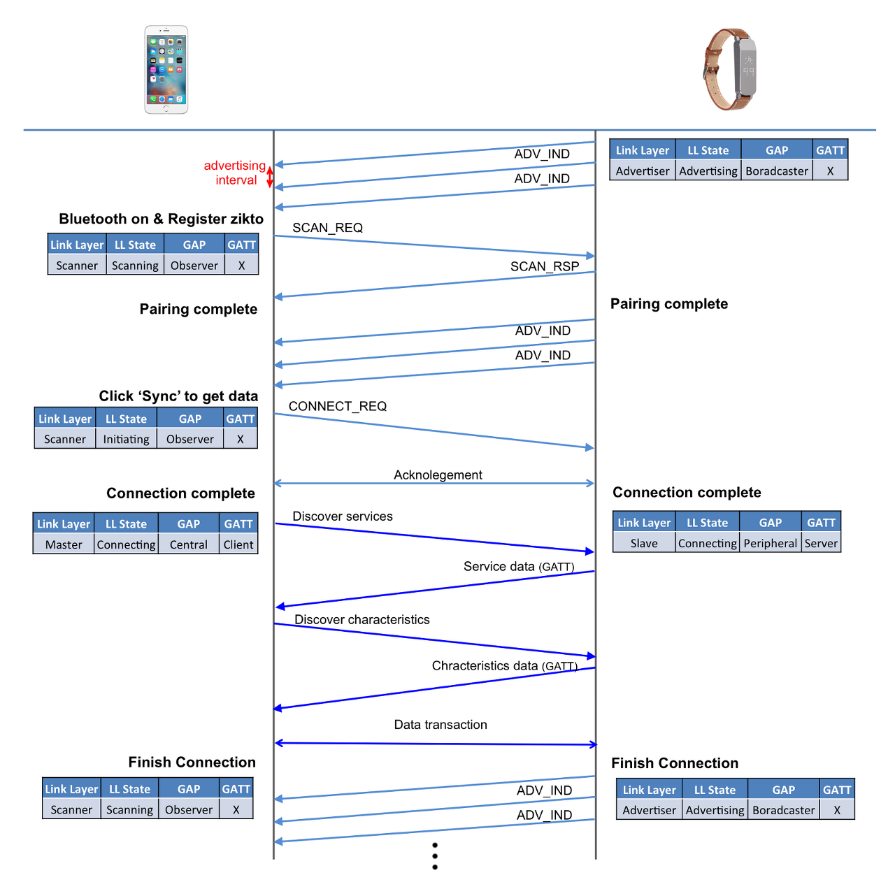connection 전에는 advertiser와 scanner의 역할, 연결 이후에는 Master와 Slave로 분류된다.