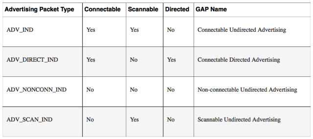 Advertising data는 연결성, 스캐닝 가능성, 방향성으로 분류된다.
