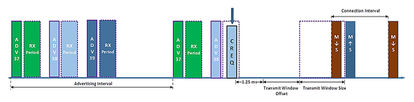 Peripheral 디바이스에서 advertising동작을 수행함으로 시작. ADV이후에 RX시간이 있어, advertising 주기와 scanning주기가 겹치는 시점에 central device의 CREQ(connection request)를 수신하게 된다. 이때 부터 무선연결의 시작