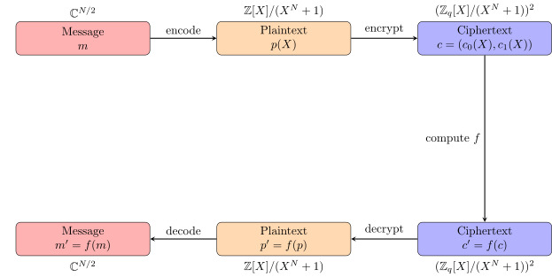 Choose a message m to be encoded Choose a scaling factor sc to determine the precision of the encoded message Use a polynomial encoder with a key (n, T) to encode m into a plaintext polynomial p(x) in Z_q[x]/(x^n+1) Encryption: