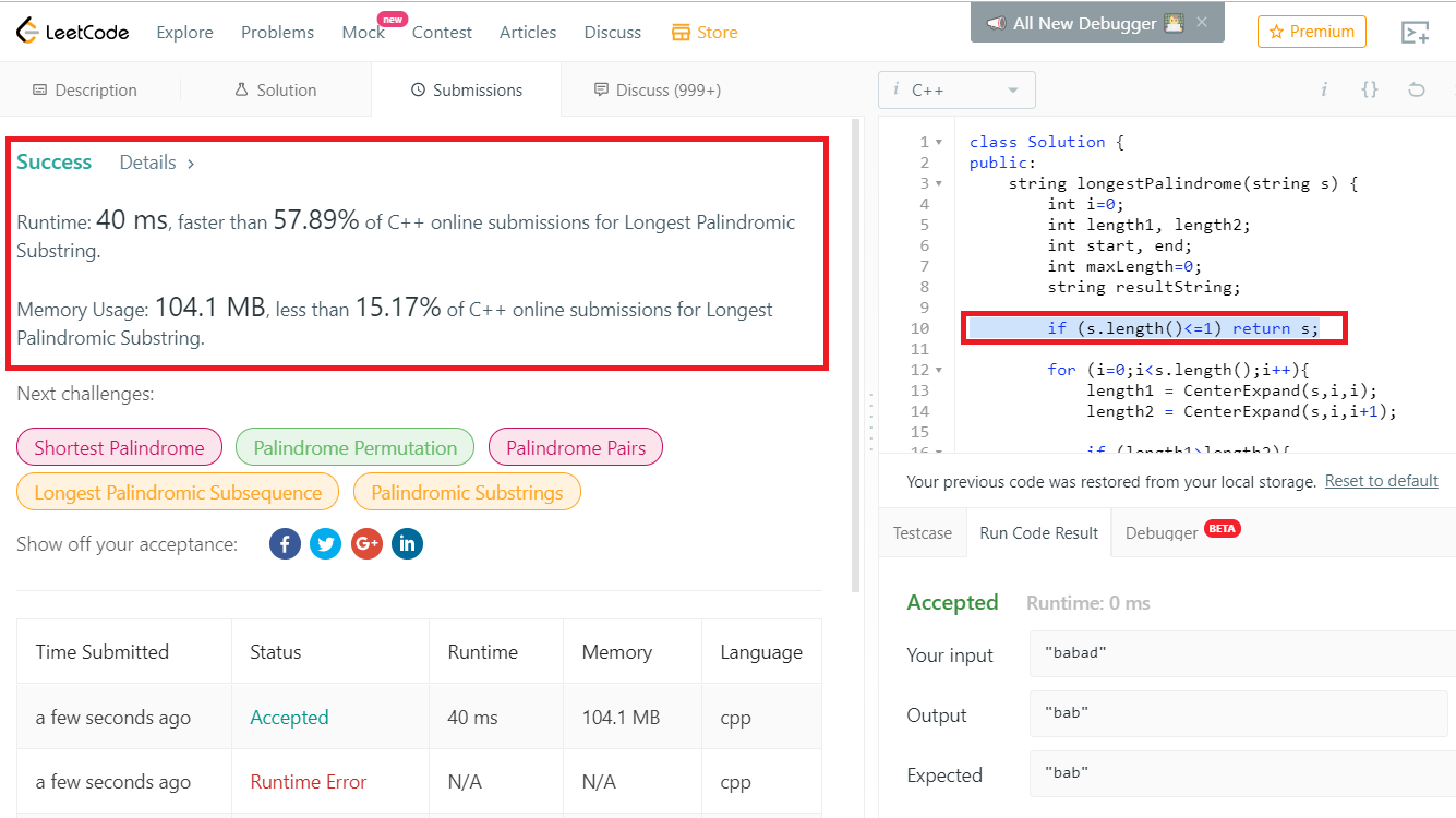 실행속도가 전체의 57% 수준이라는 것은 아직도 개선의 여지가 많이 있음을 의미할듯합니다. Dynamic programming 알고리즘을 참조하여 코드를 작성하여 현재 O(n^2)의 성능인데, Leetcode에서는 친절하게 O(n)의 알고리즘도 소개해 주고 있습니다. 이제부터 조금씩 이 알고리즘들을  WSTT https://skysign.github.io/WSTT 스터디그룹과 함께 알아가보도록 해요~