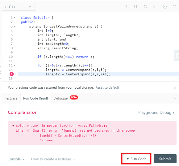 이제는 정리해본 알고리즘을 코드로 옮기는 순서입니다. 다른 coding 웹서비스들도 유사하겠지만, Leetcode에서도 곧바로 compile 뿐 아니라 친절하게 error가 난 부분까지 표시를 해주는 기능이 있었습니다. 오랜만에 다시 코딩을 하는 저로서는 각 라인별 debugging (각 변수값을 실시간 표시) 까지 지원해주는 편안함에 세상이 정말 많이 변했음을 타이핑 하며 느끼게 되었습니다. 편함
